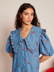 Mini length dress in a cherry-embroidered denim fabric. Detailed with an oversized collar with a gathered ruffle and embroidered edge finish. Fastened with covered buttons. The length of the dress is 85-91 cm depending on the size.